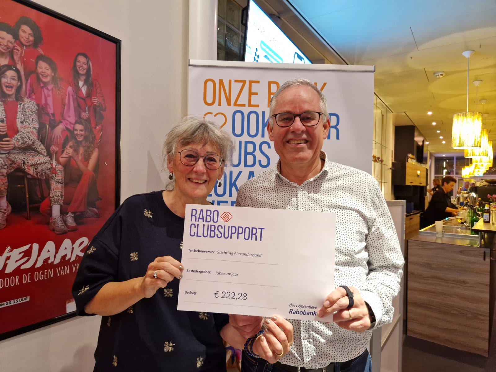 Posted on oktober 7th, 2025 by Nanette OeiOok dit jaar heeft de Alexanderband weer deelgenomen aan de RABO Club Support actie. Het totaalbedrag dat door de leden van de RABO bank aan de Alexanderband werd gesponsord bedraagt € 222,28. Op 6 oktober werd het bedrag overhandigd aan bestuursleden Paul van Gerwen en Annemarie Legius. Het gehele bedrag gaat ten goede komen aan […]